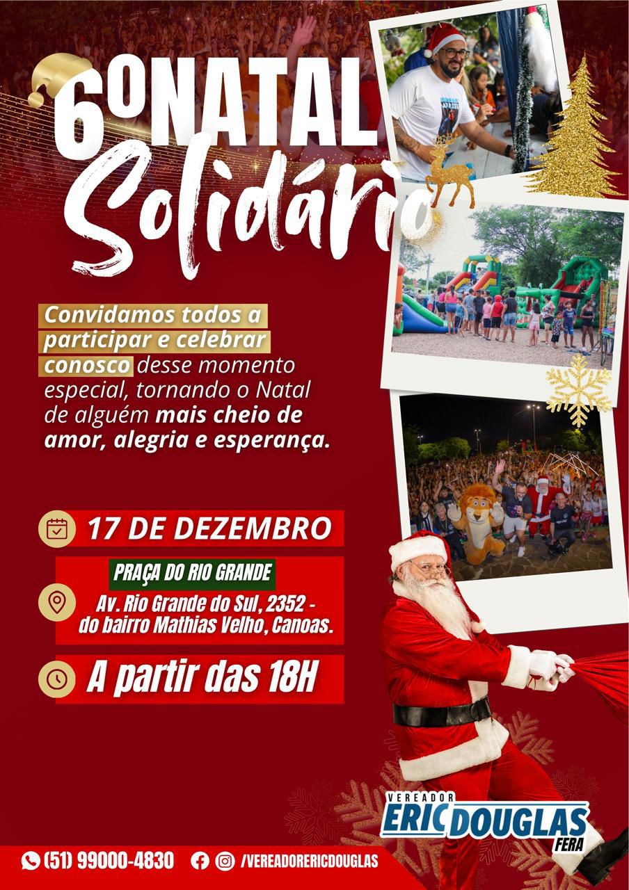 Amanhã dia 17 de dezembro, a partir das 18h, a comunidade de Canoas está convidada a participar do 6º Natal Solidário, que acontecerá na Praça do Rio Grande, localizada na Avenida Rio Grande do Sul, nº 2352, no bairro Mathias Velho.