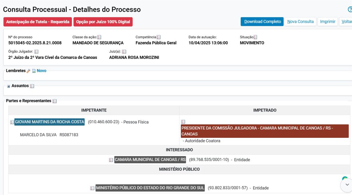 O advogado de Giovani Rocha, Marcelo Fontella, acaba de entrar com um mandado de segurança para suspender a sessão de julgamento do processo de impeachment, marcado para segunda-feira, 14 de abril, às 9 horas, na Câmara de Vereadores de Canoas. A suspensão pedida é até o julgamento do mandado de segurança pela juíza Adriana Rosa Morozini, da 2ª Vara Cível da Comarca de Canoas.