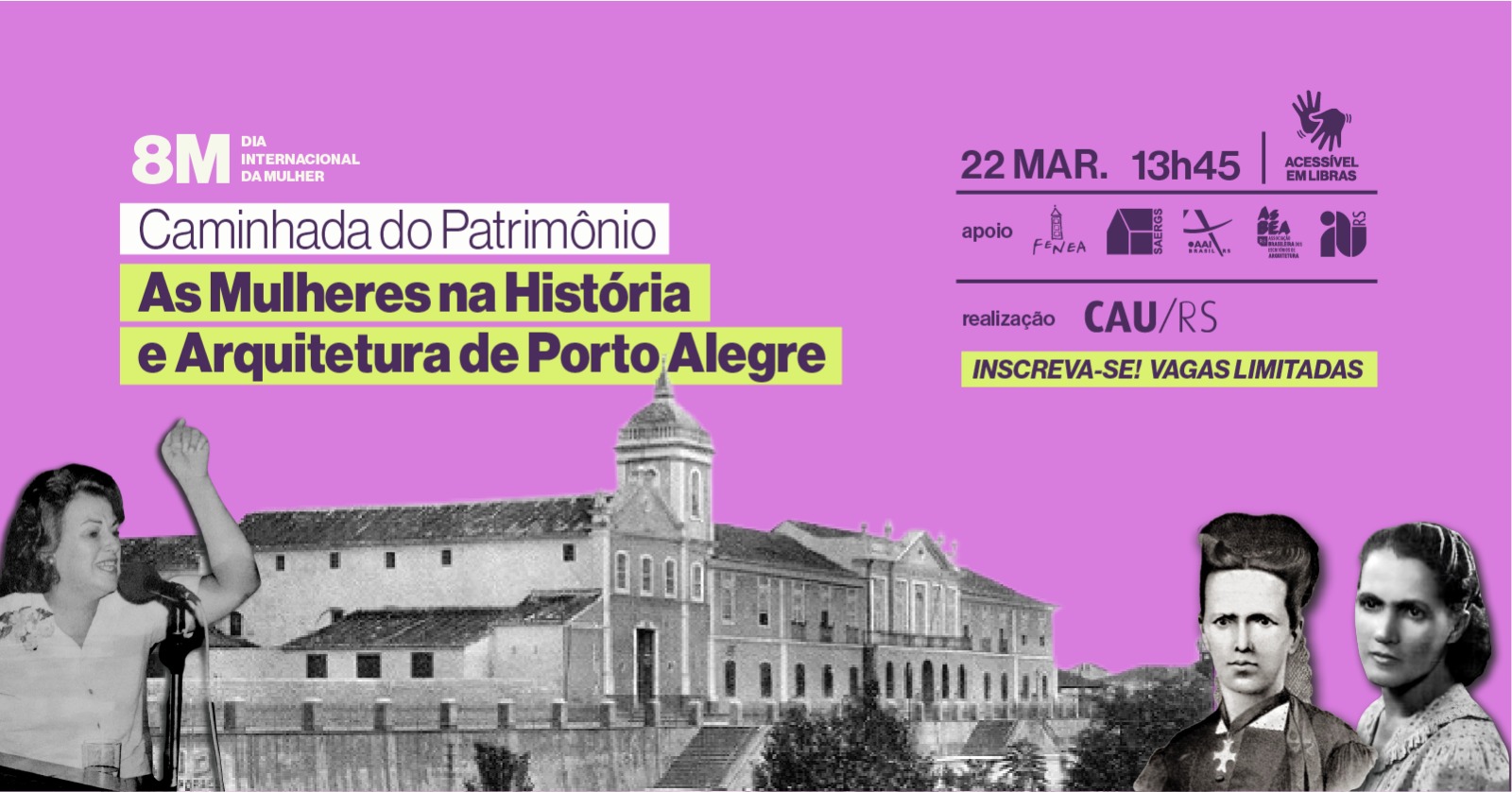 O Conselho de Arquitetura e Urbanismo do Rio Grande do Sul (CAU/RS), através do Centro de Memória do CAU/RS, convida para a Caminhada “As mulheres na história e arquitetura de Porto Alegre”, que ocorrerá no dia 22 de março. O evento celebra o Mês das Mulheres e também o Aniversário de Porto Alegre, que completa 253 anos no dia 26 de março.