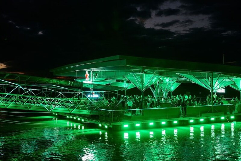 O Heineken Floating Bar é uma estrutura temporária que oferece uma experiência única, combinando gastronomia e entretenimento em um ambiente flutuante.