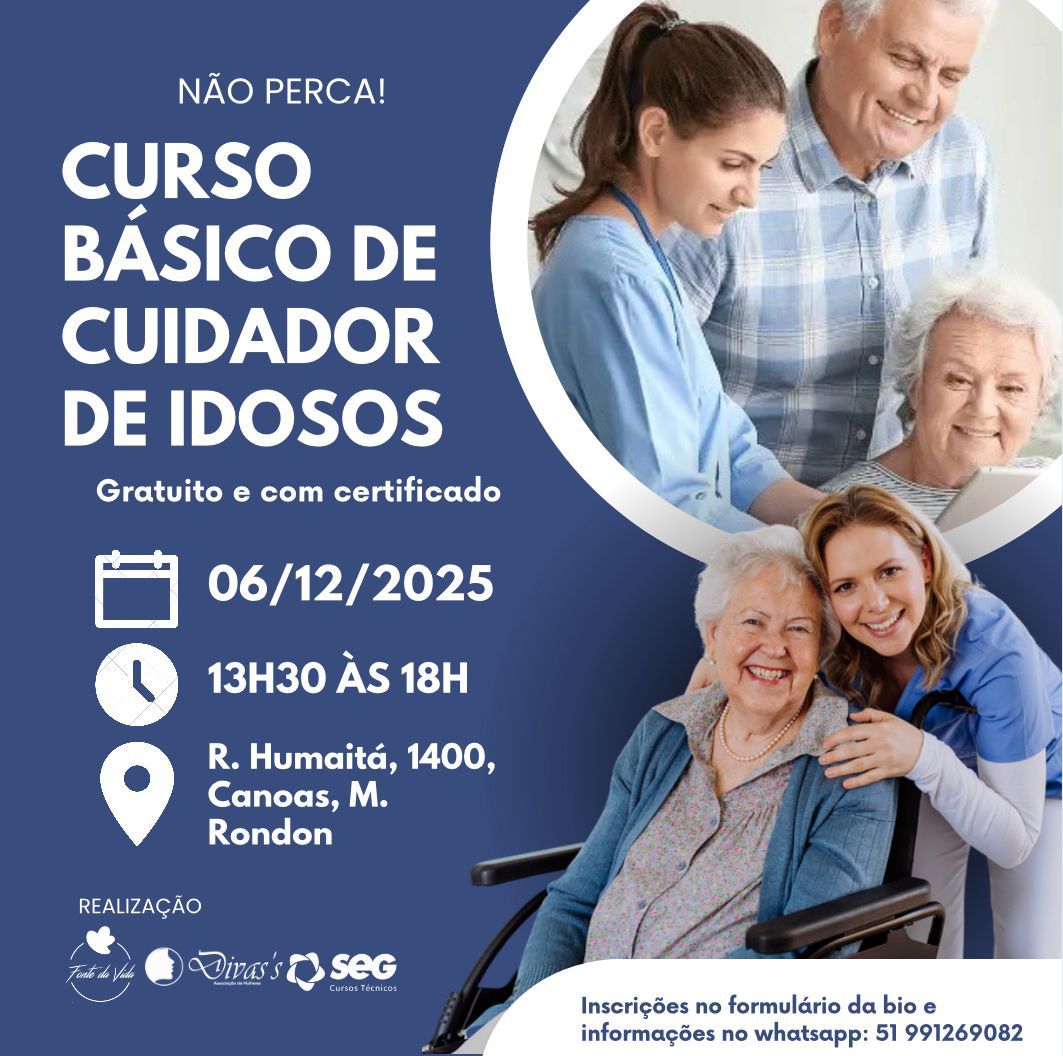 No próximo sábado, 06, a Associação Divas’s e a SEG – Escola Técnica Profissionalizante, realizarão o curso Básico de Cuidador de Idosos. A capacitação acontece na Igreja Fonte da Vida, na Rua Humaitá, 1400, bairro Marechal Rondon, em Canoas, das 13h30 às 18h.