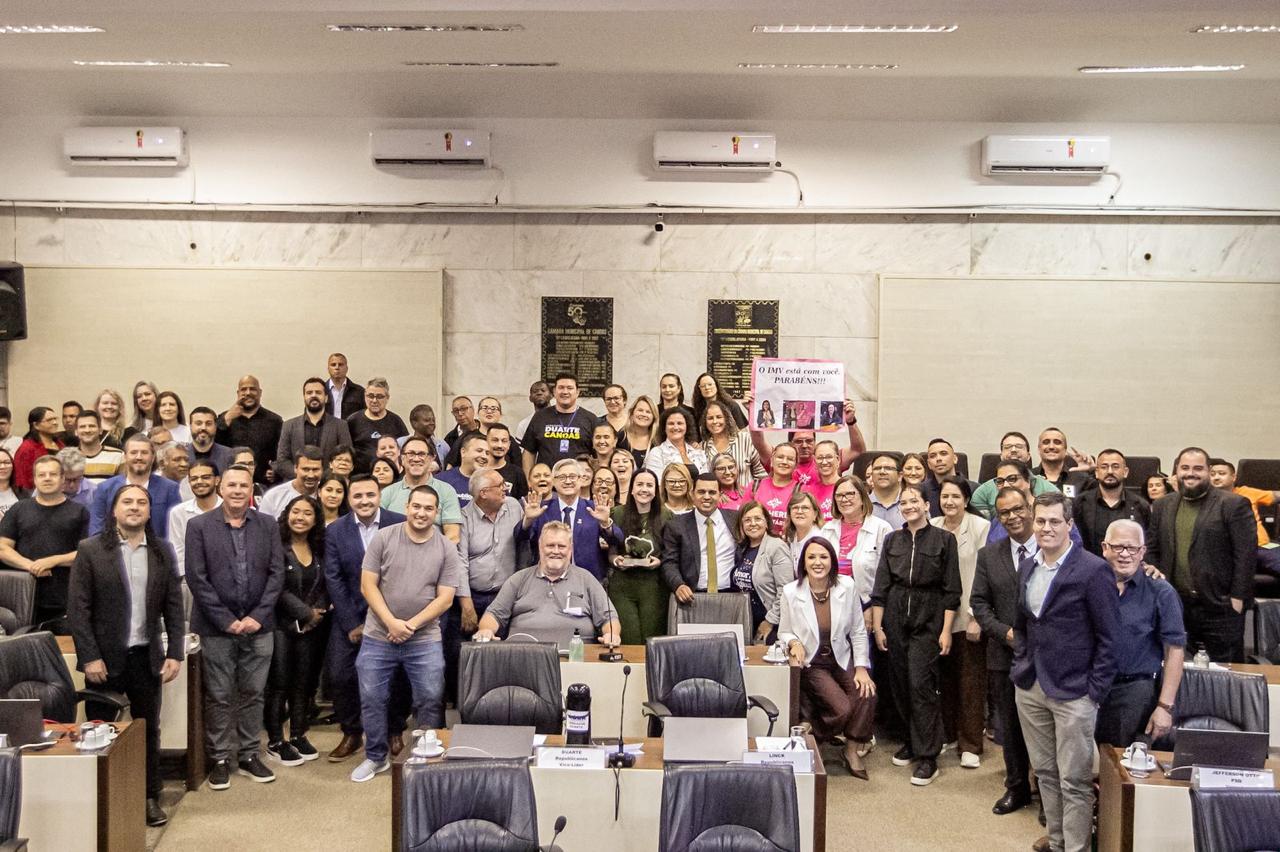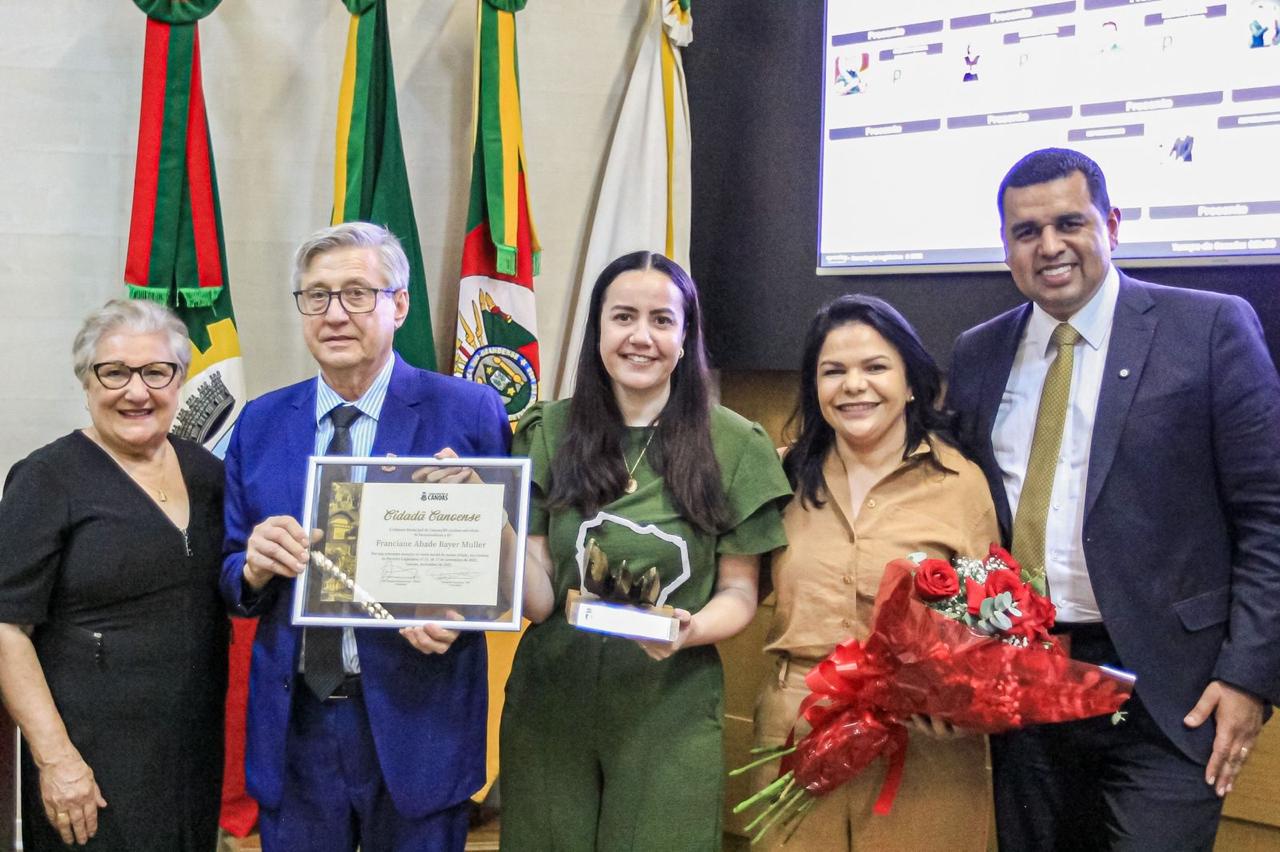A Câmara Municipal de Canoas concedeu, nesta terça-feira (9), o Título de Cidadã Canoense à deputada federal Franciane Abade Bayer Muller. A honraria, proposta pelo vereador Duarte (Republicanos) foi entregue durante o Grande Expediente da sessão ordinária, em reconhecimento aos relevantes serviços prestados pela parlamentar à cidade, tanto por meio de sua atuação legislativa quanto pelo apoio direto a políticas públicas e iniciativas de interesse da população.