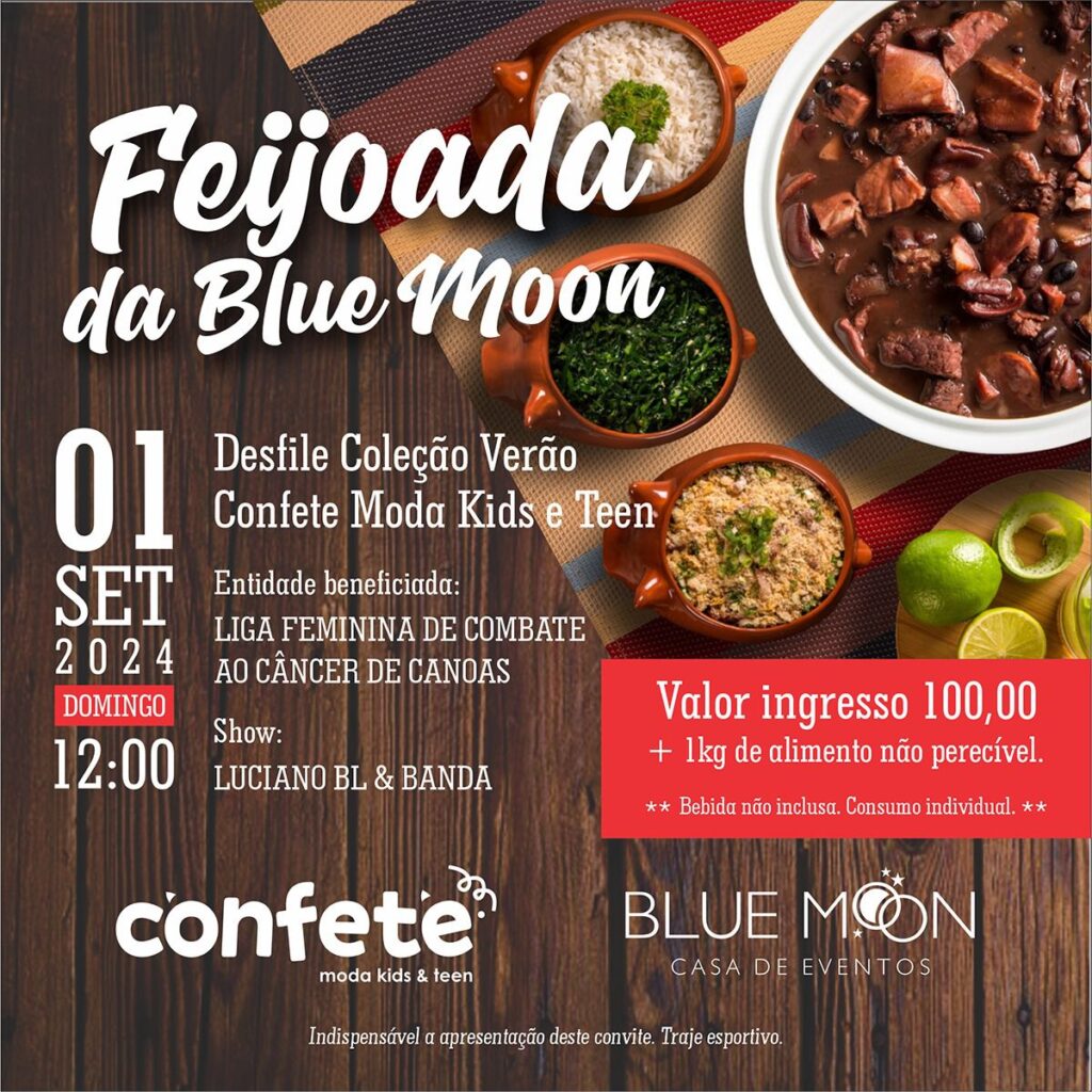 Não perca, acontecerá no dia 01 de setembro, às 12 horas, a Feijoada da Blue Moon. Será um domingo diferente para todos. A mais saborosa feijoada da região metropolitana voltou, além do sabor, com atrações divertidas, o Desfile da Coleção Verão Confete Moda Kids e Teen, mais o show de Luciano BL & Banda.