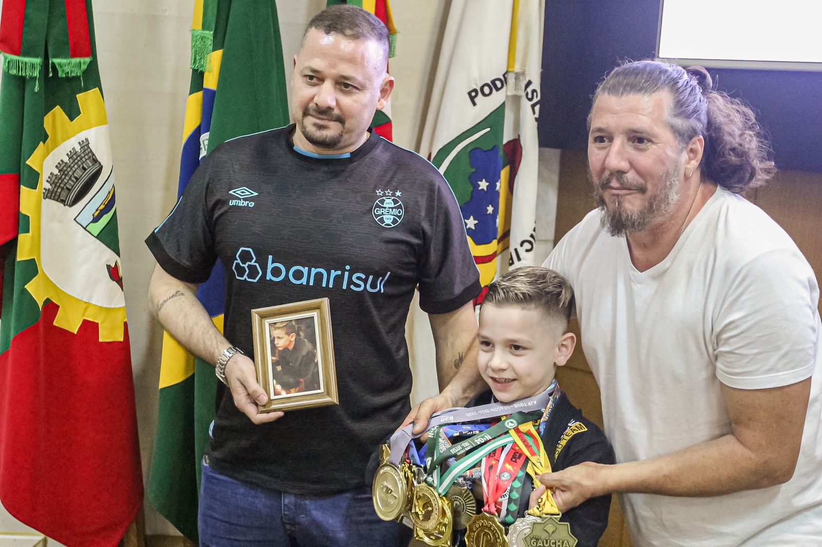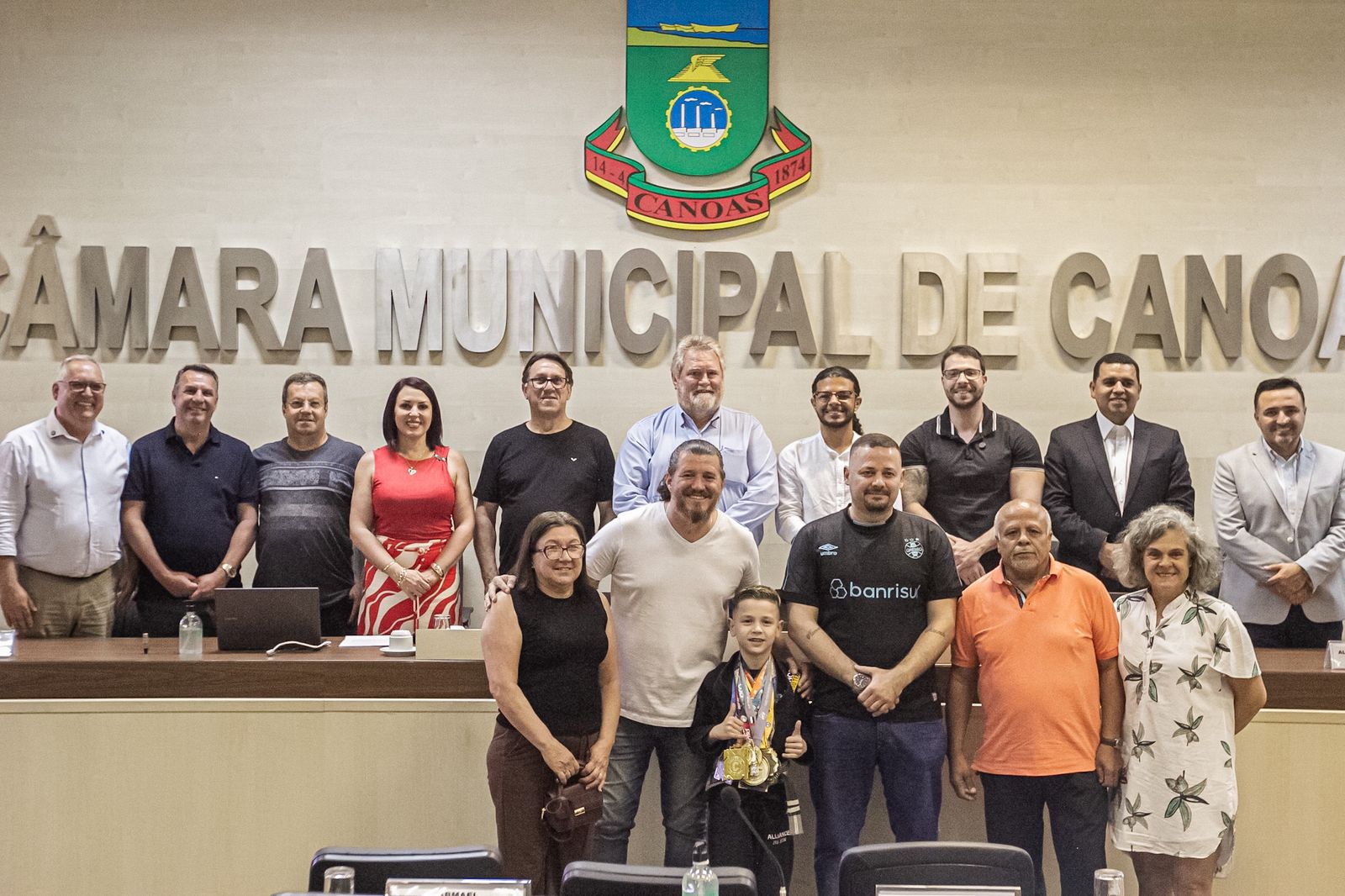 A Câmara Municipal de Canoas abriu espaço no Grande Expediente desta terça-feira (2) para a apresentação do atleta mirim Murilo de Andrade de Almeida, de apenas 8 anos, que vem se destacando no Jiu-Jitsu e representando o município em competições estaduais, nacionais e internacionais. A homenagem foi proposta pelo vereador Cris Moraes (PV), com o objetivo de reconhecer publicamente a trajetória do jovem lutador e incentivar a valorização do esporte na infância.
