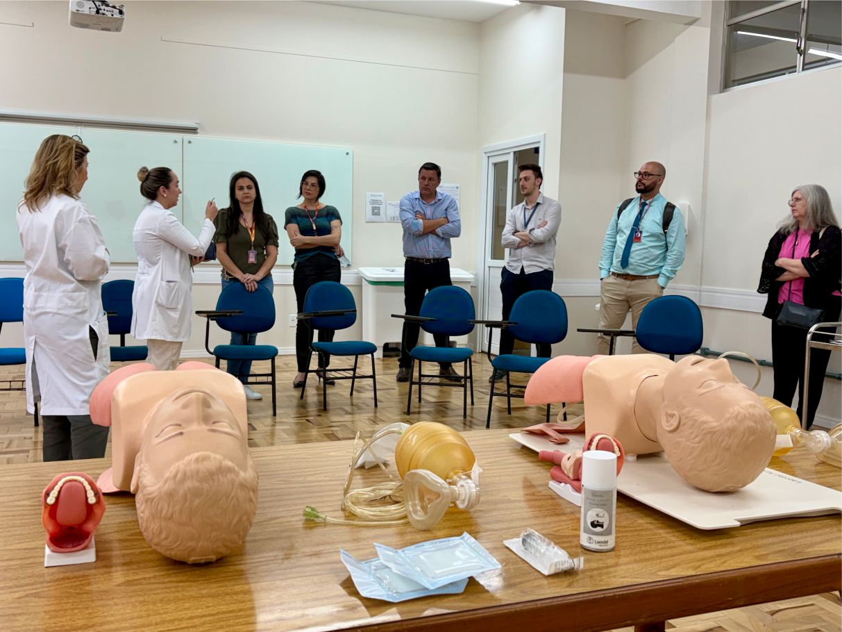 A capacitação foi estruturada em três momentos complementares, unindo teoria, prática e reflexão. Nas duas primeiras etapas, os docentes receberam material didático sobre fundamentos da simulação clínica, como planejamento de cenários, papel do facilitador e princípios de segurança psicológica, e participaram de uma visita técnica ao CSC. Durante o encontro, conheceram laboratórios, salas de controle, espaços de observação e os simuladores de média e alta fidelidade disponíveis no centro.