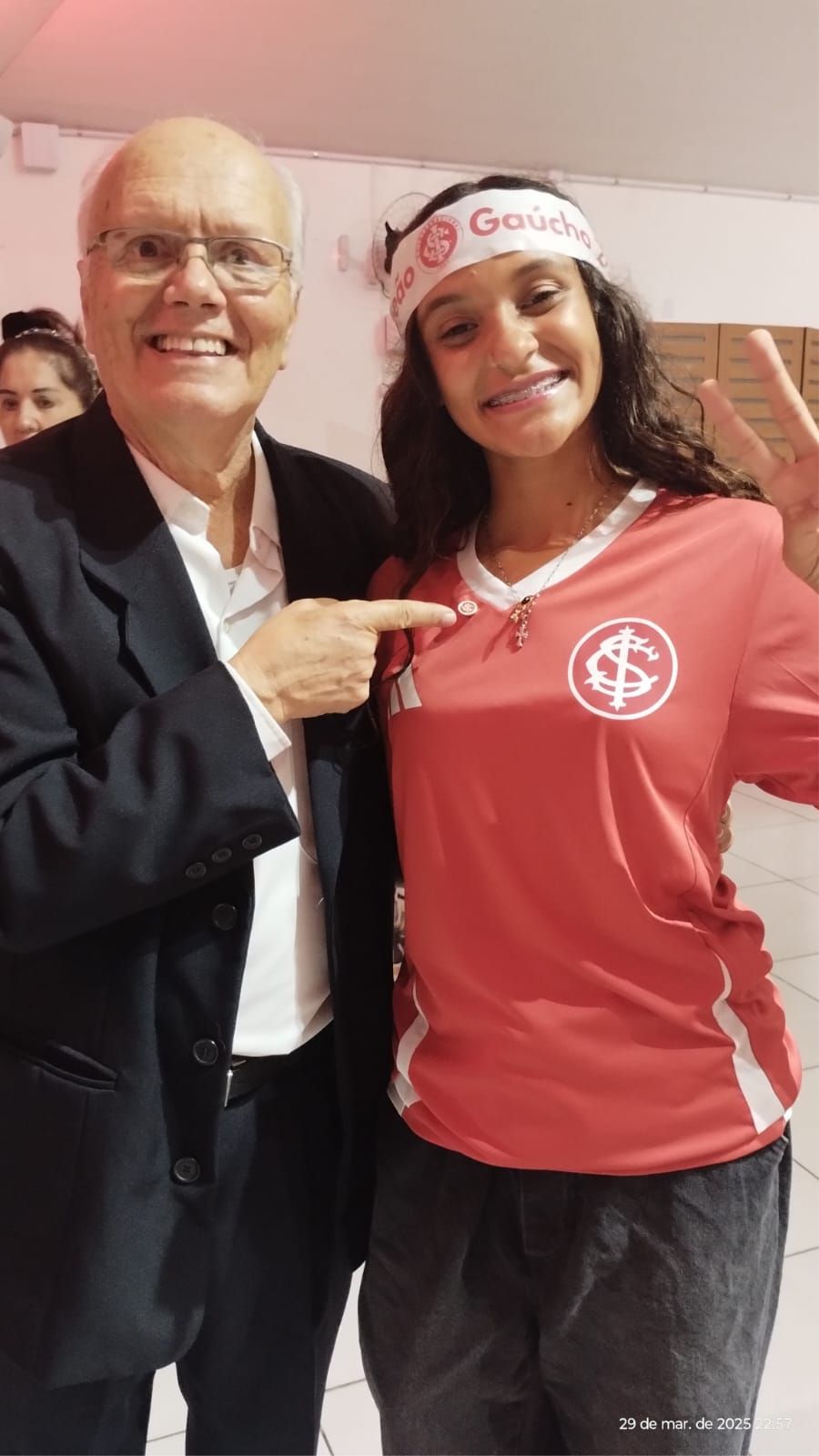 Maria Lúcia (foto), sucesso no skate, homenageada, ganhou flores e camiseta do Inter. Outro momento bonito foi uma homenagem póstuma ao colorado Martin Ingo Ahlert, que foi um grande batalhador e fez parte de diretoria do Inter, uma justa láurea para esse grande colorado.