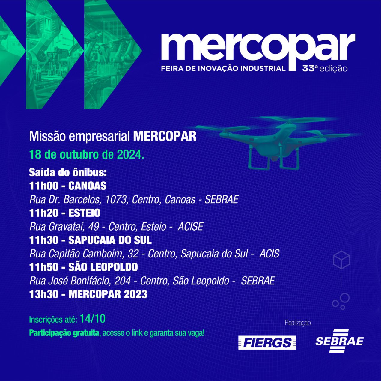 No dia 18 de outubro, o Sebrae promove uma missão empresarial à Mercopar 2024, com transporte gratuito de ida e volta e subsídio total para a participação de um dia de feira. Em Canoas, a saída ocorre às 11h na sede do Sebrae (Rua Dr. Barcelos, 1073), com paradas posteriores em Esteio, Sapucaia do Sul e São Leopoldo. A previsão de chegada ao evento, em Caxias do Sul, é 13h30, e o retorno ocorrerá às 20h, seguindo o mesmo itinerário da ida.